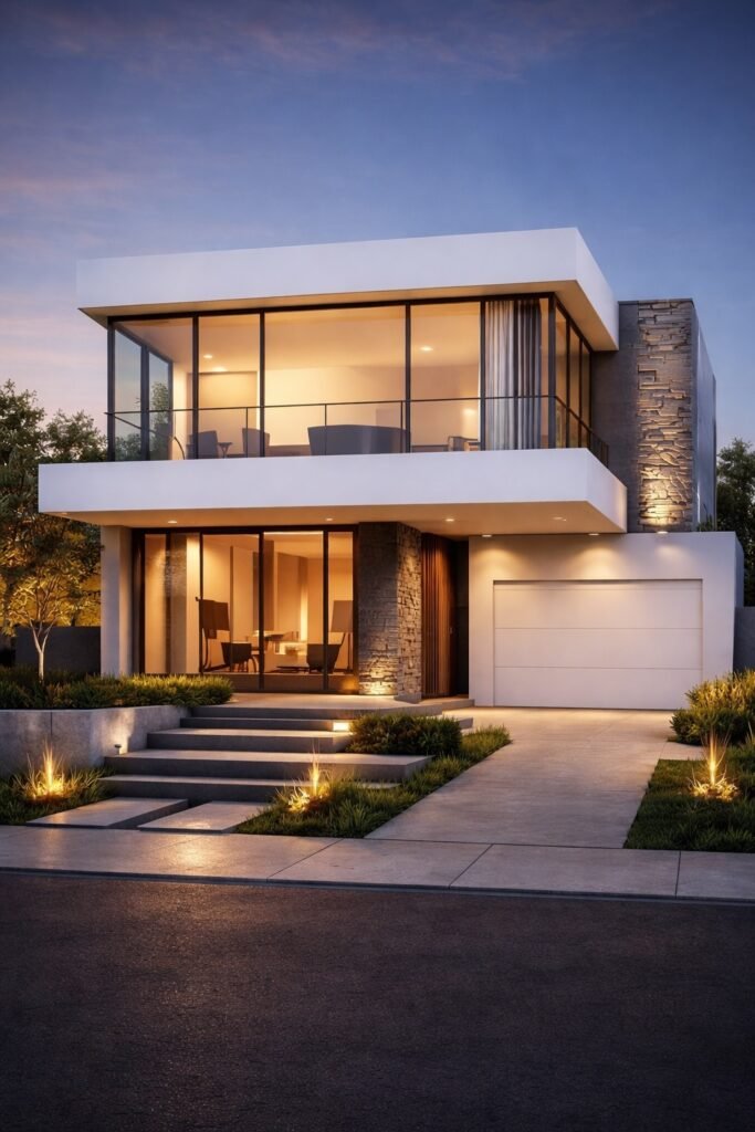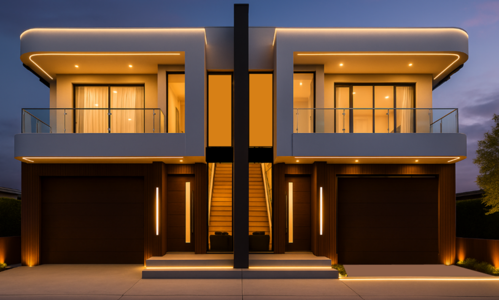 A contemporary duplex design showcasing symmetry, strong vertical articulation and refined material selection.