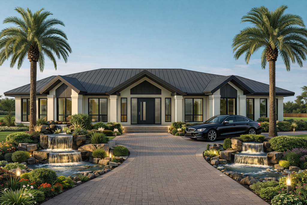 Designed for a spacious acreage setting, this residence blends contemporary form with a country-inspired layout.