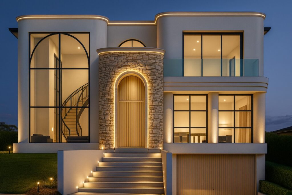 A contemporary classic residence that blends modern proportions with traditional arched detailing.