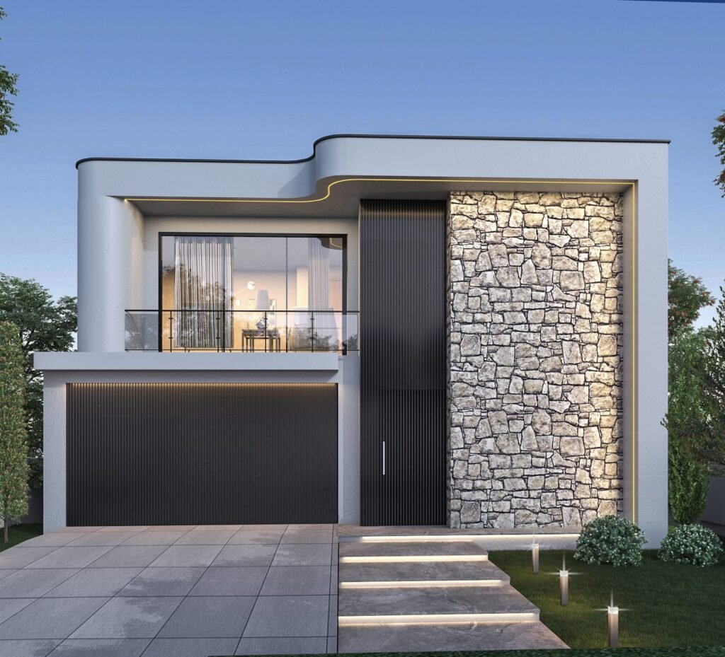 This contemporary residence is defined by sculptural curves and a strong architectural presence. A textured stone feature wall is paired with smooth rendered forms and vertical battens to create contrast and depth.